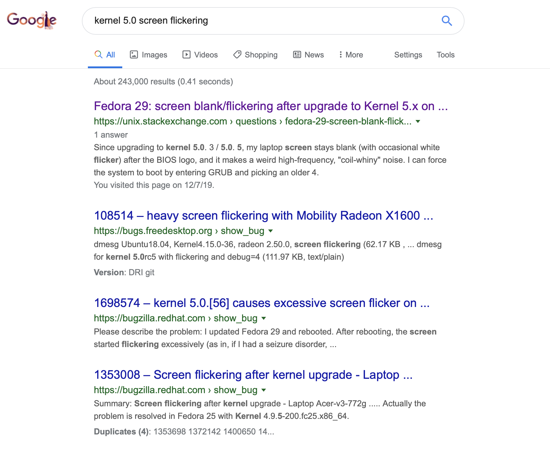 마치 하드웨어 (디스플레이 부분)의 불량인듯 보였지만, 윈도우로 부팅하게되면 이런 증상은 나타나지 않았기에 서비스를 맡기기에도 애매하였는데요. 검색을 해보니 (키워드: kernel 5.0, screen flickering) 리눅스 커널이 5.0 버전으로 올라가면서 eDP (아마도 디스플레이 패널 관련) 드라이버의 코드가 변경됨에 따라 일부 LCD 패널에서 발생하는 문제라고 합니다.