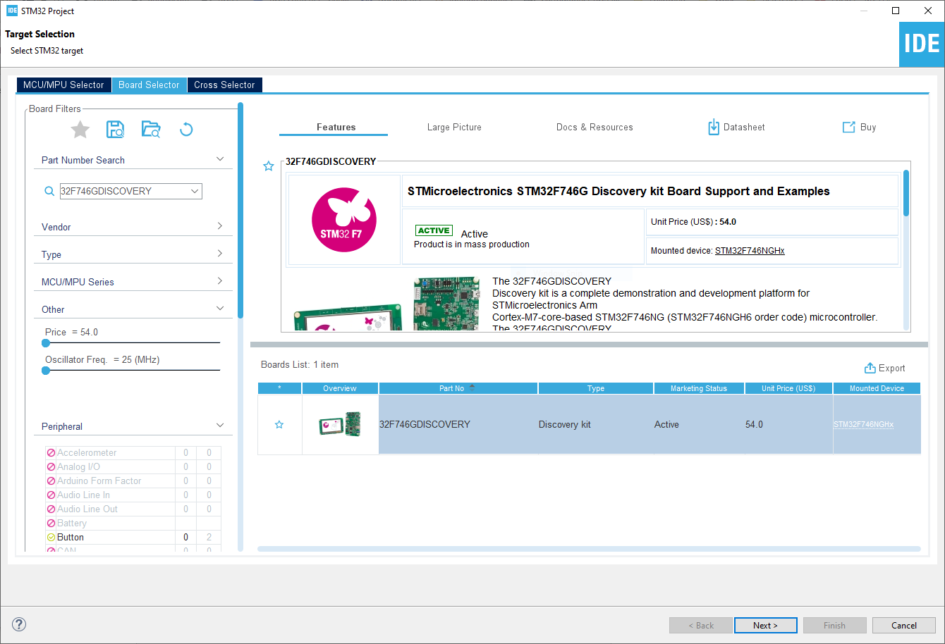 프로젝트 생성은 예전 데모와 마찬가지로 File > New > STM32 Project 로 시작한다. 보드도 역시 현재 보유한 32F746GDISCOVERY를 선택하고 다음으로 진행.