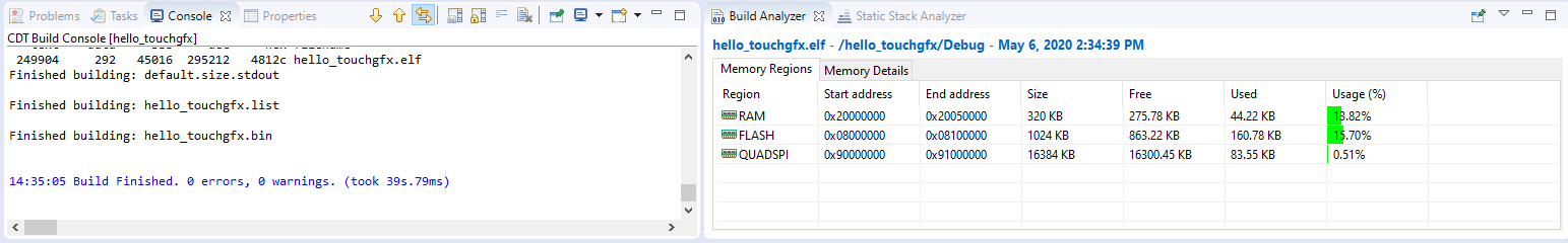 이제 저장하고 프로젝트 빌드 Project -> Build Project. 에러없이 빌드가 완료되면 다음과 같이 각 메모리 영역의 사용량 등이 나옴.