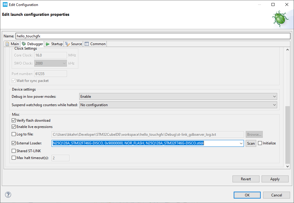 이때, Debugger 항목에서 External Loader를 체크하고, 현재보드에 연결된 외장 FLASH 모델을 선택. Apply하고 확인을 눌러 계속 진행.