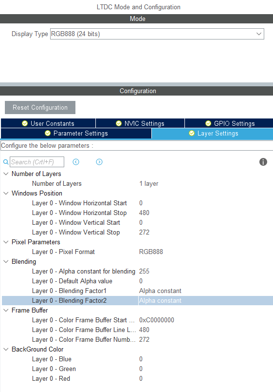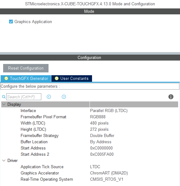 그러면, 좌측에 Additional Software 탭과, TouchGFX 관련 설정 항목이 생성됨. Graphics Application를 체크하고 다음과 같이 설정.