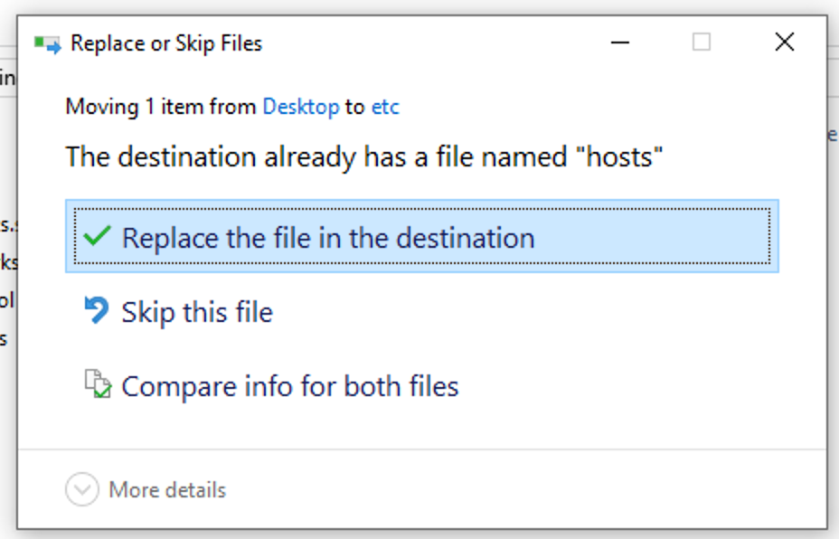 그런 다음 수정된 파일을 C:\Windows\System32\drivers\etc에 복사해 넣는다.