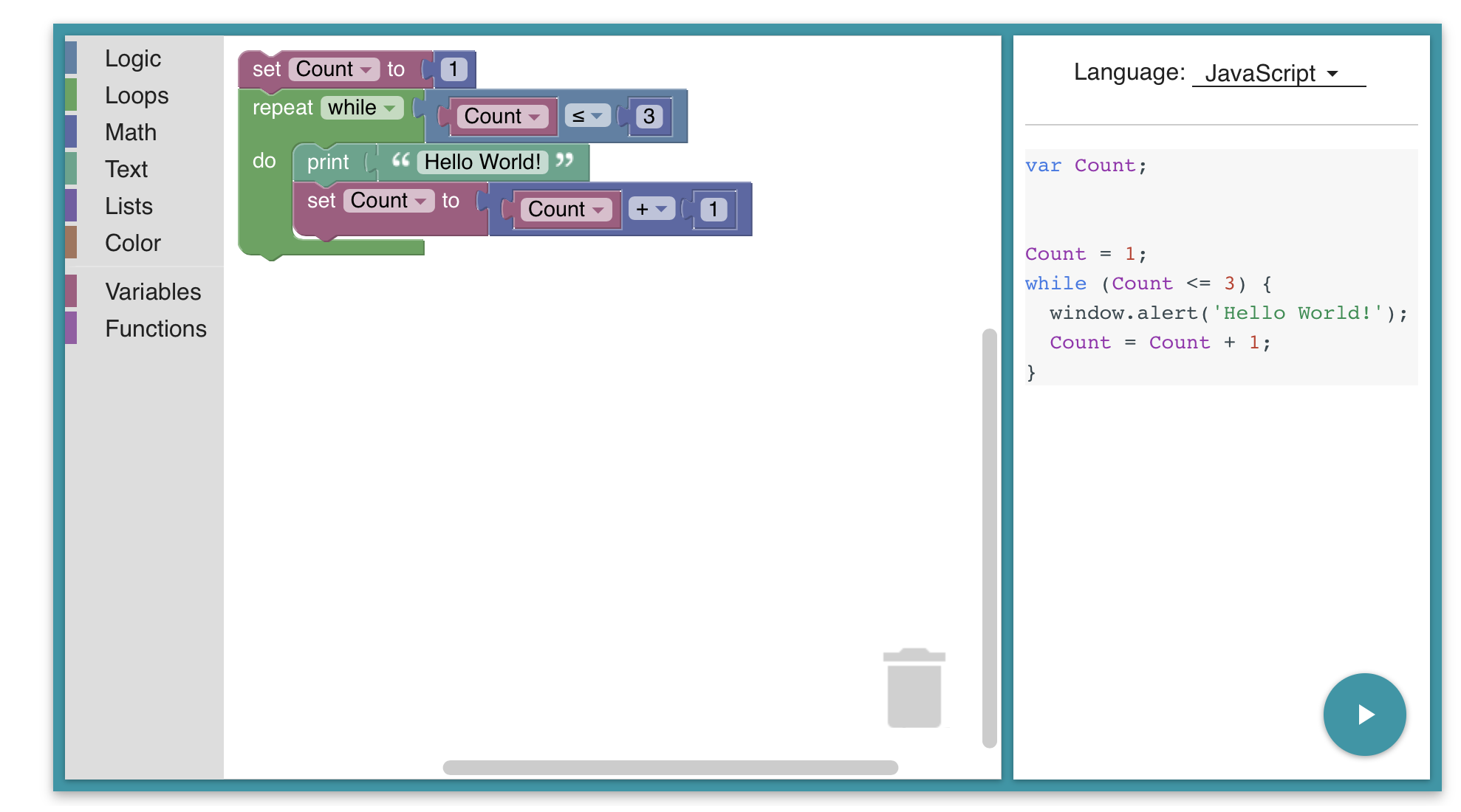 블럭으로 만들어놓은 부분을 각종 언어 (Javascript, Pythom, Lua, Dart 등)로 생성이 가능하다. 또 사용자가 원하는 블럭도 생성이 가능하다. 코어가 Javascript로 되어 있어, 웹은 물론 Android, iOS에서도 WebView를 통해 실행이 가능하다. (동일한 코드로)