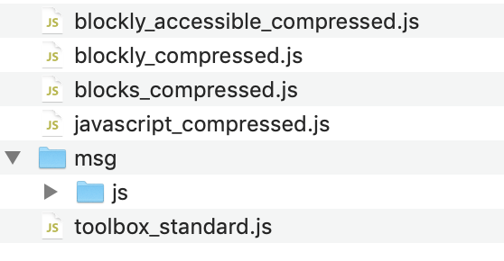 다음으로 demos/mobile/html/toolbox_standard.js 툴박스 파일도 작업 디렉토리로 복사한다. 또 localization 관련한 디렉토리도 복사한다. 복사 위치는 msg 디렉토리 밑으로 한다. 본래 Blockly 디렉토리의 msg/js 디렉토리를 현재 개발 디렉토리로 복사한다. 완료되었으면 다음과 같이 보여야 한다.