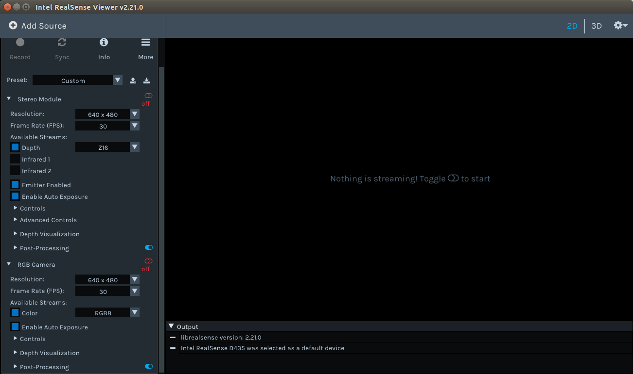 이제 리얼센스 카메라를 연결하고, 테스트용 프로그램인 realsense-viewer를 실행해본다.