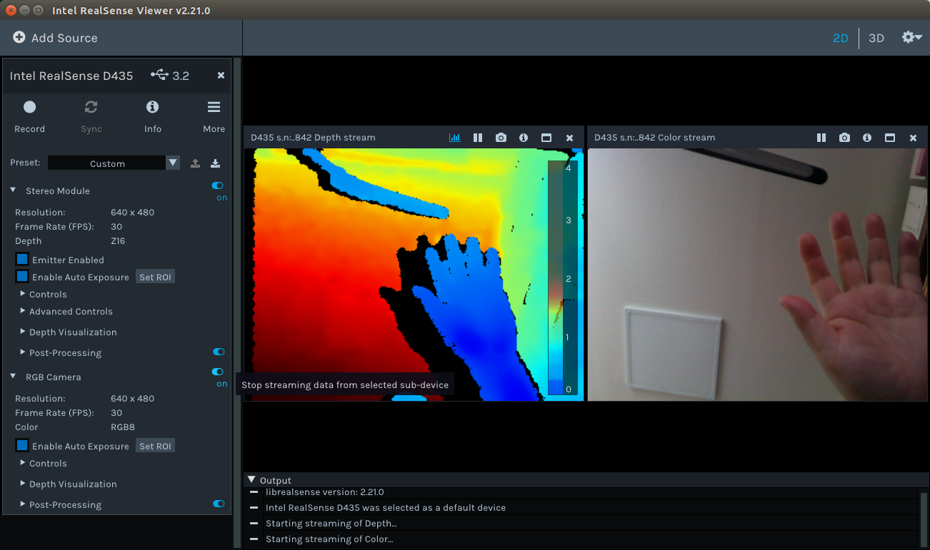 Depth 이미지와 RGB 이미지가 정상적으로 잘 보인다. 코어의 성능때문인지 30프레임이 다 나오는 것 같진 않다.